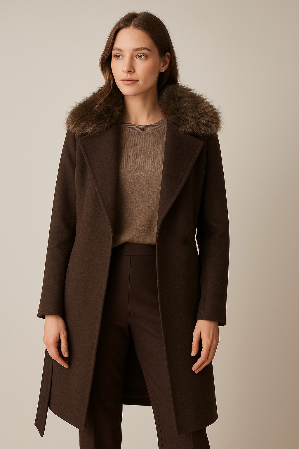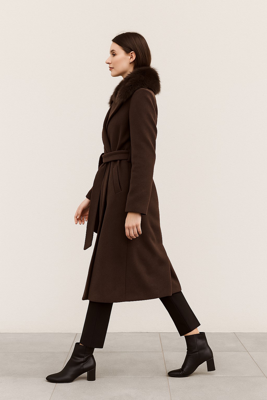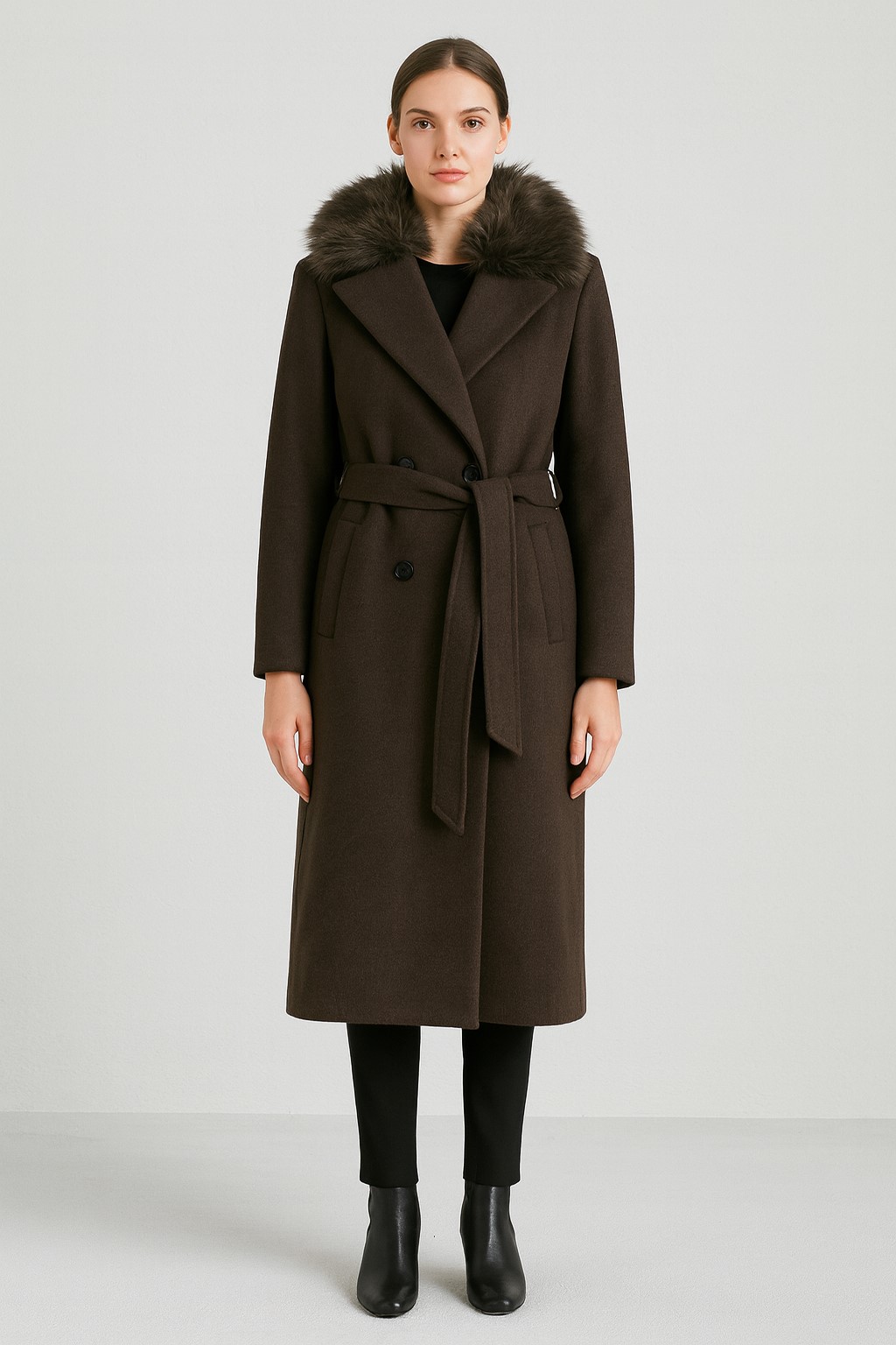 EKOL Yakası Kürklü Beli Kuşaklı Kaban 6001 Kahve