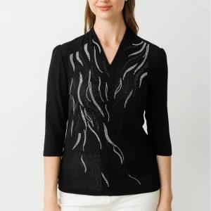 Detaylar / Özellikler: Ön kısmındaki taş işlemelerle hareketli bir görünüm sunar, V yaka formu boyun hattını dengeli şekilde vurgular, truvakar kol kesimiyle rahatlık sağlar.