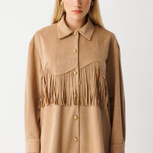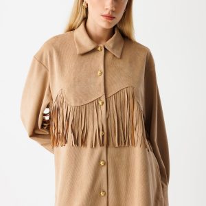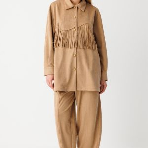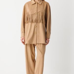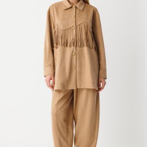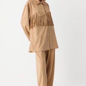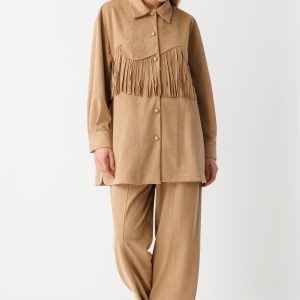Pantolon beli lastikli, düğme kapamalı, gömlek yaka, manşetli, püskül detaylı süet takım-