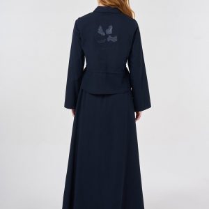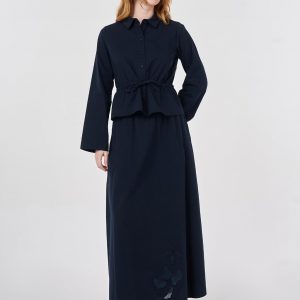 Gömlek yaka, düğme kapama, bel bağcıklı, sırtı nakış aplikeli bluz. Lastikli yüksek bel, astarlı etek. Bluz ve etekten oluşan ikili takımdır.