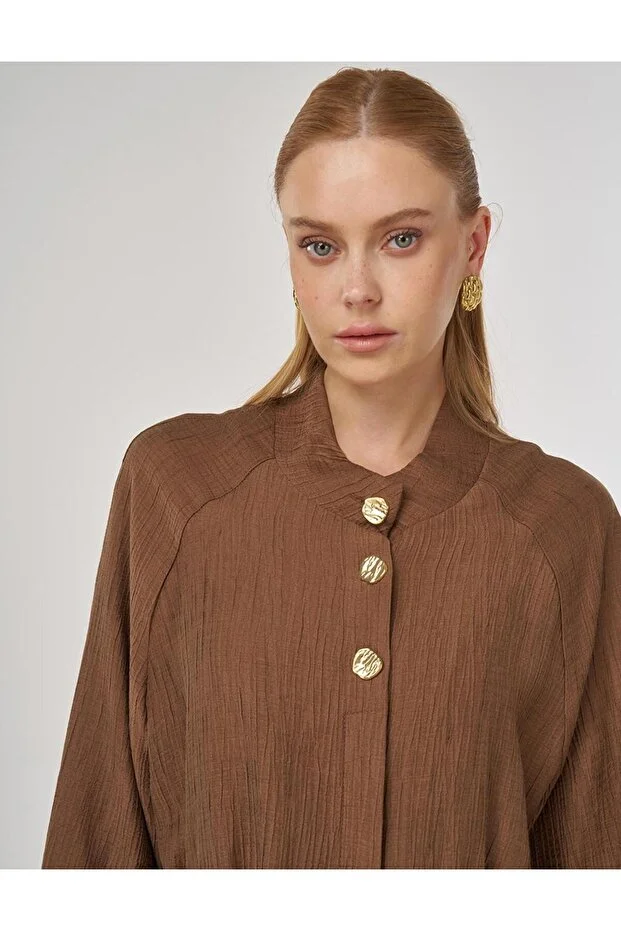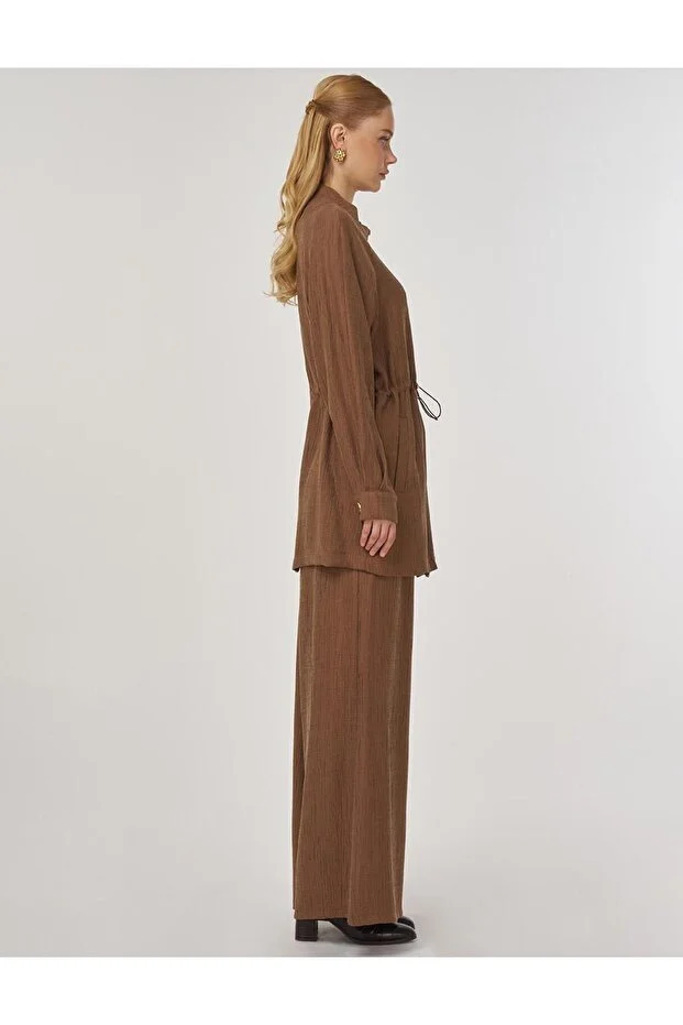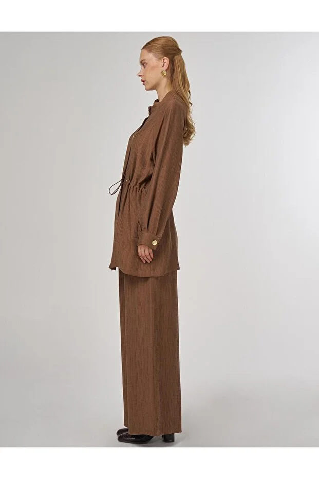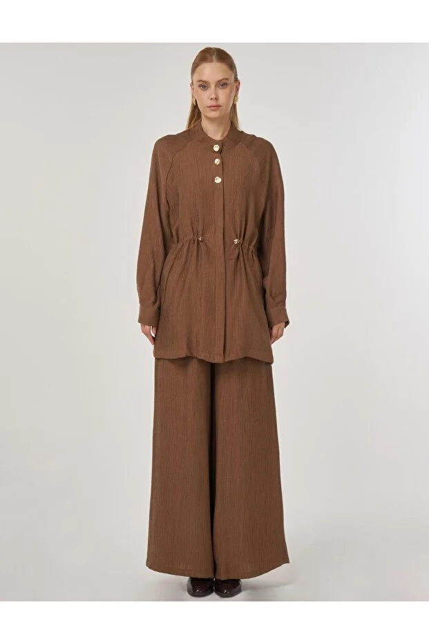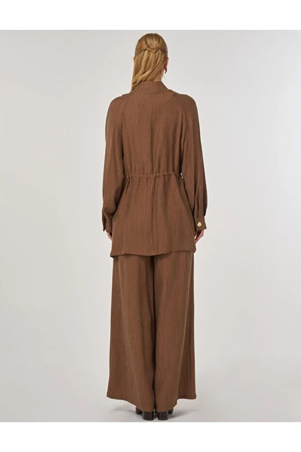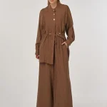 Hakim yaka, patı gizli düğme kapama, reglan kol, beli ayarlanabilir lastikli, yanlardan cepli, pileli manşetli tunik. Lastikli bel, bağcıklı, geniş paça, yanlardan cepli pantolon. Tunik ve pantolondan oluşan ikili takımdır.
