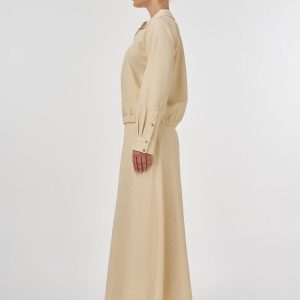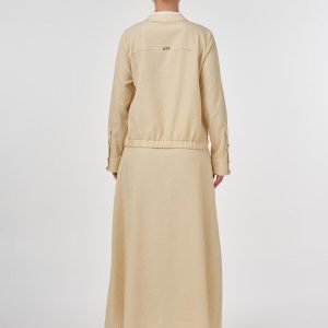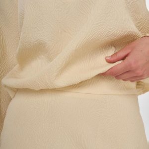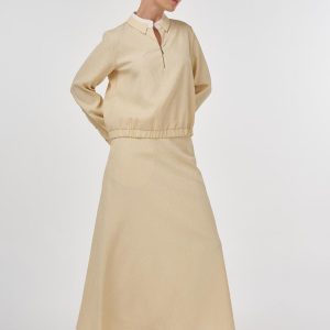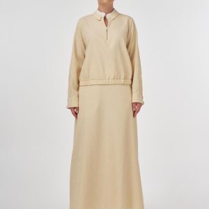 Katlı yaka, yarım pat fermuar kapama, bilekleri düğme kapamalı, pileli manşetli, etek ucu lastik büzgülü bluz. Yüksek bel, yandan fermuar kapamalı, astarlı, cepli etek. Bluz ve etekten oluşan ikili takımdır.