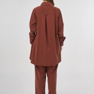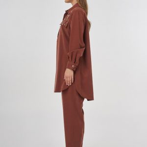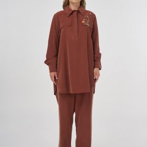 Gömlek yaka, patı gizli düğme kapama, kapak cepli, bilekleri lastik büzgülü, boncuk işlemeli, pileli manşetli tunik. Yüksek bel, arka beli lastikli, fermuar kapamalı, pensli pantolon. Tunik ve pantolondan oluşan ikili takımdır.