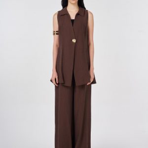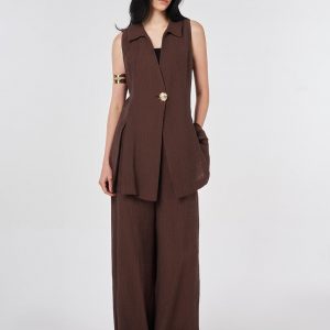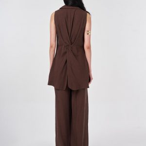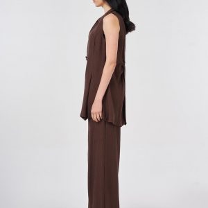 Gömlek yaka, kolsuz, tek düğme kapamalı, astarsız yelek. Yüksek bel, arka beli lastikli, fermuar ve düğme kapamalı, yanlardan cepli pantolon. Yelek ve pantolondan oluşan ikili takımdır.