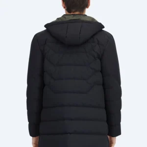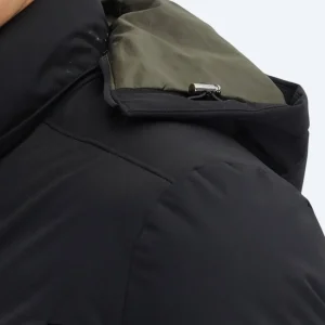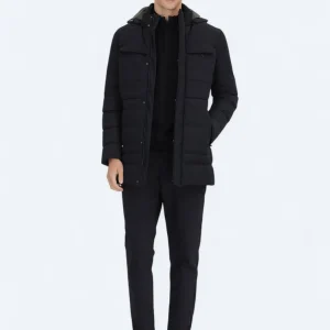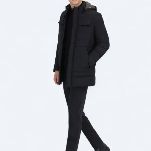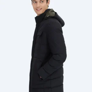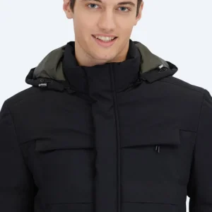 Kapüşonlu formu ve tam astarlı yapısıyla konforlu bir kullanım sunan siyah kaban, dayanıklı polyester kumaşıyla rüzgâr ve soğuğa karşı korur.