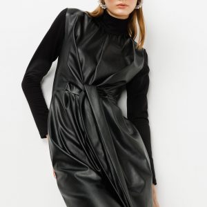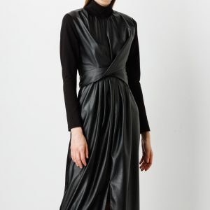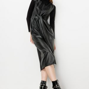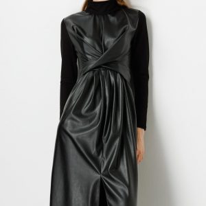 MODAİLGİ Bağlama Detaylı Yırtmaçlı Deri Elbise 6007