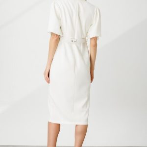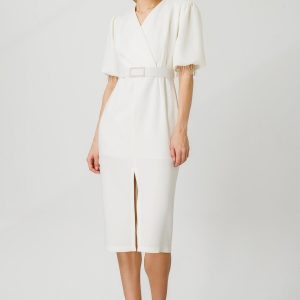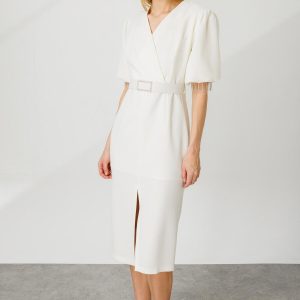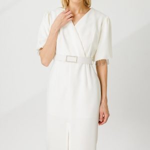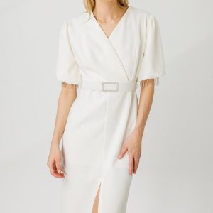Modailgi Şerit Taşlı Balon Kol Elbise Ekru