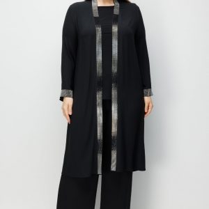 • Üst parçanın yaka hattı boyunca boydan boya inen, tasarıma lüks ve görkemli bir hava katan dikey Gümüş Taş İşlemeleri.